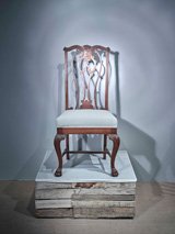 STYLISTIC FEATURES: An interpretation of the French Rococo style of furniture which was adopted by Chippendale himself, the chair has a yoke-shaped toprail, a pierced vertical backslat with sharply carved foliate scrolls, and an upholstered seat raised on finely structured legs. While the front legs of the chair are of the lion's feet design -- a type of cabriole design -- the rear legs, of the Marlborough style, terminating in a block foot, are devoid of any elaborately carved elements.