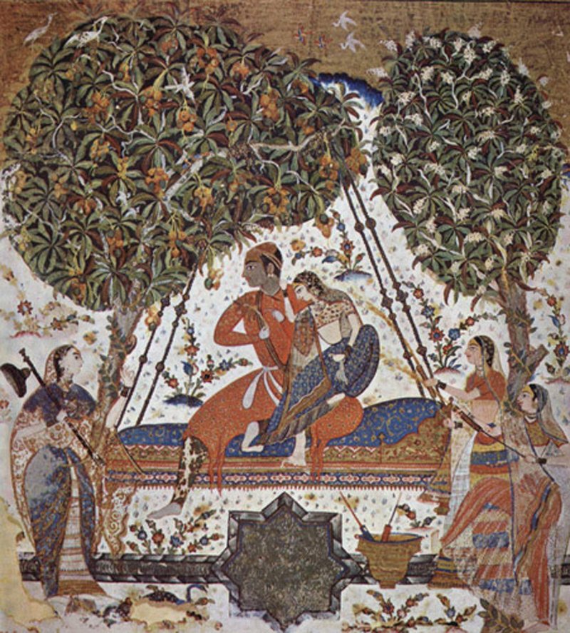This Deccani-style miniature painting from the late-16th century is associated with the onset of the spring festival (vasant ritu) observed during the month of phalguna. The tree, along with the swing (hindola), sets the mood of the painting which depicts the raga vasant. A number of references seem to be implicit in this evocative depiction — for instance, one is reminded of Kalidasa’s Raghuvamsa, a Sanskrit epic poem, which describes the movement of the swing akin to that of young women swaying with their lovers during festive occasions. The couple sway together on a swing tied to the branches of the tree, while attendants spray them with fragrant, coloured water which the nayika tries to dodge. An attendant plays the ektara, a stringed instrument. The newly-sprouted branches of the trees and the process of playing with water both resonate with the joys of springtime.