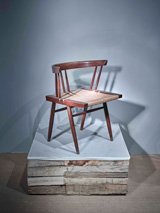 STYLISTIC FEATURES: The chair reflects traditional Japanese woodworking methods. The simple design reflects in its form – the backrest has finely structured stiles, complete with a curved, semi-circular cresting rail. The rectangular seat, woven using twine made out of natural grass, is supported by four slender, tapered legs comprising the ‘H’-shaped stretcher. The dowel construction work on the joints skirting the apron of the seat is deliberately made visible – an embodiment of Nakshima’s philosophy to expose and express structure in design.