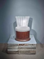 STRUCTURAL FEATURES: The wooden base of the armless chair is akin to a stool or an ottoman, while the semi-circular back has a fan-shaped flared form, a classic characteristic of the Art Deco style. The rich Art Deco style largely comes into India via Bombay in the 1920s. The style also stems from the fascination with speed, movement and the kinetic nature of transportation during the Machine Age.