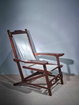 STRUCTURAL FEATURES: This is an example of British campaign furniture whose structure involves an amalgam of features of two colonial-style chairs -- the classic planter’s chair, as well as the Roorkhee chair. The durable canvas seat alludes to the Roorkhee chair -- the nomenclature of which can be attributed to the Indian Army Corps of Engineers in Roorkhee – which was widey used by British officers from the late-1880s to around the Second World War. The wooden frame with long armrests, however, is a striking characteristic of the planter’s chair.