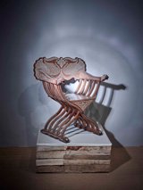 STRUCTURAL FEATURES: Known as the ‘X-frame’ chair or the Scissors Chair, this folding chair is supported by two crossed and curved supports, forming an X-shape visible from the back and the front. The structure developed during the late-15th to early-16th century Italy, and this style of the chair is associated with Girolamo Savonarola, a preacher from the Renaissance period. It is possible that he did, in fact, possess such a chair as monks often used folding chairs. The intricately carved toprail is connected to the back of the straight arms, and the rather narrow seat is fixed with fitted wooden slats on both sides. A rendition of the X-Chair found its way to Chennai’s Connemara Public Library in the late 1890s.