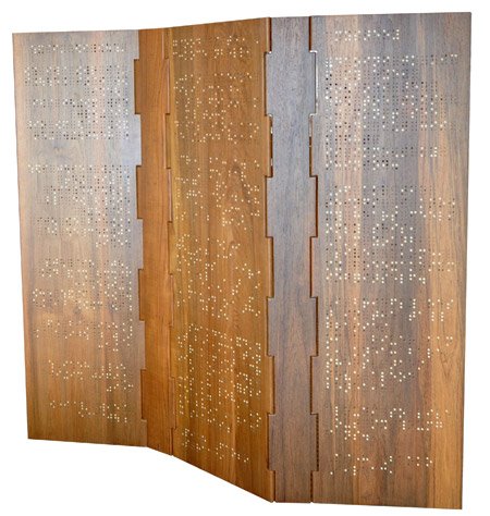 A Braille pattern is used as an underlying graphic to craft the screen. Over 1,00,000 holes are hand-drilled into the 1” thick panels (along the Braille pattern), with a variation of small 1/16th” and 1/4th” holes, in keeping with the Braille text.